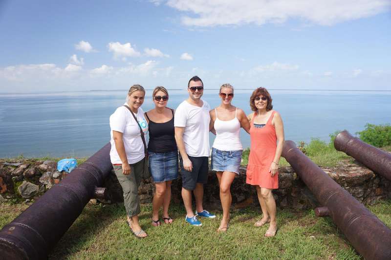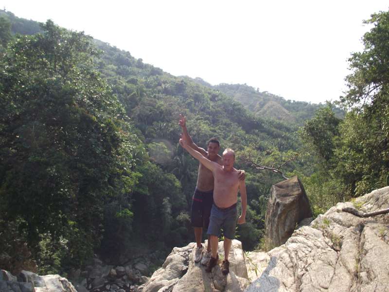 Well, that is exactly what we found on our visit. At first, I thought my boys would be bored and miserable, but I have to say this was one our most memorable family vacations. The Njoi team took care of everything, from the meeting us, along with 18 other potential buyers at the airport in Toronto, arranging the puddle jumper from Roatan, landing on the Fanasty Island landing strip in Trujilio (that was so neat – actually having to do a fly by to warn the wildlife to get off the runway), having cold beers and towels waiting for us when we landed, arranging the transportation to the Campemento Hotel where we were greeted by Ole, Auturo and their whole staff. The Njoi team arranged for local tours to the towns of both Trujilio and Santa Fe where we were able to talk with the locals and get a real feeling of the towns and the people, and seeing the Fortress of Santa Barbara. Our other day trips included, snorkeling in blue waters, swimming at the starfish colony, and my best memory the hike to the natural waterfalls. Making the trek and swimming with my boys in the pool of the most beautiful waterfalls I have ever seen was awesome. Oh, and Paul’s little adventure of falling and going over the falls with his camera.