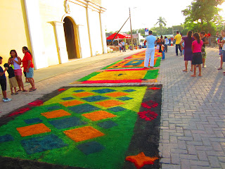 Semana Santa or Holy Week….a very big holiday for Central America! The streets of Trujillo were bustling with vendors and traditional Honduran cuisine stands. My favorite part was the ¨The Laying of the Carpet¨. Men and women stay up all night on Good Friday to have these colorful displays in front of the church for morning mass! And these fantastic works of art are made of colored saw dust!!!