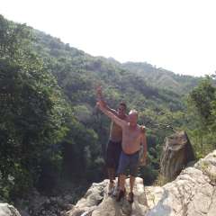 Well, that is exactly what we found on our visit. At first, I thought my boys would be bored and miserable, but I have to say this was one our most memorable family vacations. The Njoi team took care of everything, from the meeting us, along with 18 other potential buyers at the airport in Toronto, arranging the puddle jumper from Roatan, landing on the Fanasty Island landing strip in Trujilio (that was so neat – actually having to do a fly by to warn the wildlife to get off the runway), having cold beers and towels waiting for us when we landed, arranging the transportation to the Campemento Hotel where we were greeted by Ole, Auturo and their whole staff. The Njoi team arranged for local tours to the towns of both Trujilio and Santa Fe where we were able to talk with the locals and get a real feeling of the towns and the people, and seeing the Fortress of Santa Barbara. Our other day trips included, snorkeling in blue waters, swimming at the starfish colony, and my best memory the hike to the natural waterfalls. Making the trek and swimming with my boys in the pool of the most beautiful waterfalls I have ever seen was awesome. Oh, and Paul’s little adventure of falling and going over the falls with his camera.